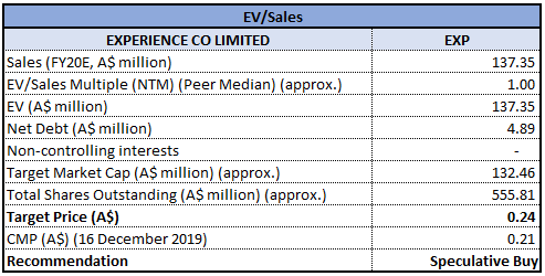 Stock Recommendation: As per ASX, the company’s stock is trading below the average of its 52-week trading range of $0.155 - $0.355. As on 16 December 2019, the company’s market capitalisation stands at ~$113.94 million, with 555.81 million outstanding shares. The company’s increased focus on core business activities, organic growth, enhancing operational efficiency and strong revenue base along with its core skydive product enhancement are key positives of the business. Considering the aforesaid facts, we have valued the stock using Enterprise Value to Salesbased relative valuation method and arrived at a target price of lower double-digit upside (in % terms). Hence, we recommend a “Speculative Buy” rating on the stock at the current market price of $0.210, up 2.439% on 16 December 2019.