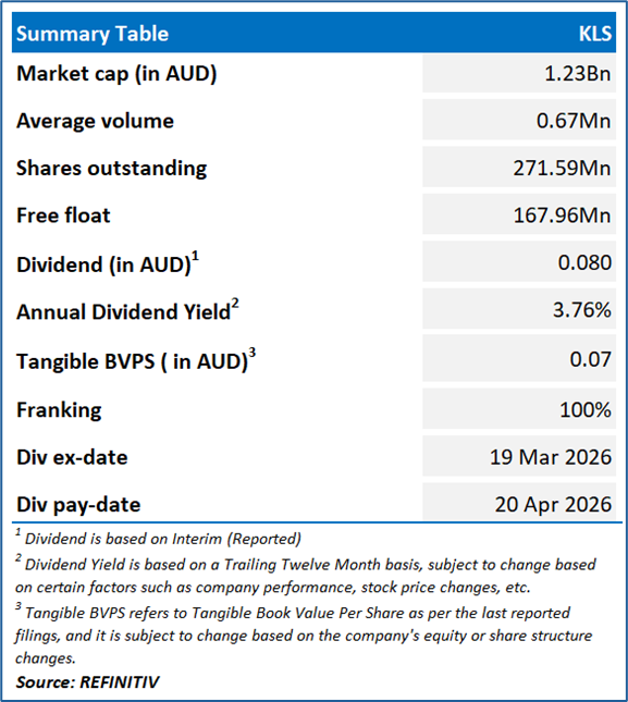 KLS is an Australia-based integrated multi-modal transport provider and tourism operator. The company’s segments include Marine and Tourism, Australian Bus and International Bus.