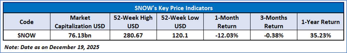 Snowflake Inc. (NYSE: SNOW) is a cloud-native data platform that enables enterprises to securely store, manage, and analyze large-scale data across multiple clouds, supporting advanced analytics, data sharing, and AI-driven workloads. The Company operates a usage-based, subscription model and serves a broad global customer base across industries, positioning itself as a core infrastructure layer for enterprise data and artificial intelligence strategies.