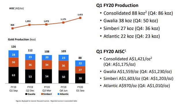 Outlook for FY20:Gwalia gold production is now expected to be in the range of 175 to 190 koz. Total production from Simberi operations is expected to be in the range of 110 to 125 koz. Atlantic Goldproduction is expected to be in the range of 95 to 105 koz.AISC for Gwalia operation is anticipated to range between $1,390/oz and $1,450/oz and that for the Simberi operations is predicted to be between $1,285/oz and $1,450/oz. Atlantic operation AISC is expected to be in the range of $900/oz - $955/oz.