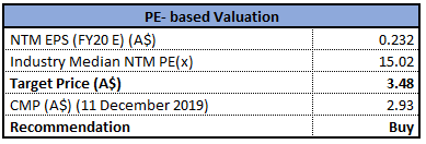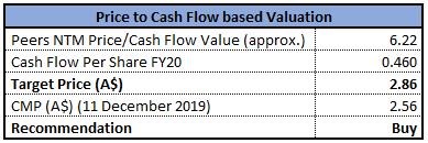 Stock Recommendation: As per ASX, the company’s stock is trading below the average of its 52-week trading range of $2.430 - $5.152. As on 11 December 2019, the company’s market capitalisation stands at ~$1.73 billion. The business has attracted further growth opportunities after the company took major steps to enhance its growth prospects through planned reserve expansion and regional drilling programs. Considering the aforesaid facts, we have valued the stock using one relative valuation method, i.e., price to cash flow multiple based approach and arrived at a target price with lower double-digit upside (in % terms). Hence, we give a “Buy” recommendation on the stock at the current market price of $2.560, up 3.226% as on 11 December 2019.