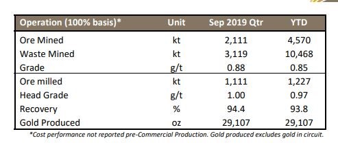 Quarter Highlights for the Period Ended 30 September 2019: Gruyere generated 29,107 ounces of gold during the quarter. Cash balance at the end of the quarter came in at $65.3 million. The company sold 12,461 ounces of gold at an average price of $2,052/ounce.