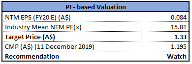 Stock Recommendation: Over a period of one year, the stock has generated a return of 87.90%. As per ASX, the company’s stock is trading above the average of its 52-week trading range of $0.590 - $1.645. As on 11 December 2019, the company’s market capitalisation stands at $1.02 billion. The development of Gruyere along with enhanced project pipeline, portends good growth opportunities for the business. Gold production for CY19 is expected to be at the upper end of the guidance range. Given the backdrop of the above factors, we have valued the stock using one relative valuation method, i.e., price to earnings multiple based approach and arrived at a target price with lower double-digit upside (in % terms). However, given the decent returns in a period of one year, we have a watch stance on the stock at the current market price of $1.195, up 2.575% on 11 December 2019 and suggest investors to wait for better entry levels.