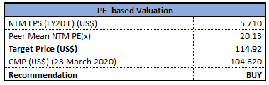 Stock Recommendation: The stock of EFX closed at $104.62 with a market capitalization of ~$12.68 billion. The stock is currently quoting at the lower band of its 52-week trading range of $103.01 to $164.77. The company made considerable improvement in its multi-year $1.25 billion EFX 2020 cloud technology transformation in FY19. Considering the aforesaid facts, we have valued the stock using price to earnings multiple based relative valuation method. For the purpose, we have taken the peer group - TransUnion (NYSE: TRU), Verisk Analytics Inc (NASDAQ: VRSK), Factset Research Systems Inc (NYSE: FDS), to name few, and arrived at a target price of lower double-digit growth (in % terms). Hence, we recommend a “Buy” rating on the stock at the closing price of $104.62, down 0.97% as on 23 March 2020.