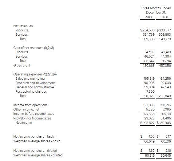 Q4FY19 Operational Highlights for the Period ended 31 December 2019: During the quarter, the company reported non-GAAP earnings per share of 76 cents, up from the year-ago figure of 59 cents. Revenues for the quarter came in at$614.4 million, an increase of 21% year over year. Segment wise, Product revenues increased 19% year over year, whereas Services revenues went up by 23. On geographical basis, revenues from America increased 23%, went up by 22% in APAC and 19% in EMEA. Cash flow from operations during the period stood at $190.4 million, with free cash flow amounting t0 $143.2 million.