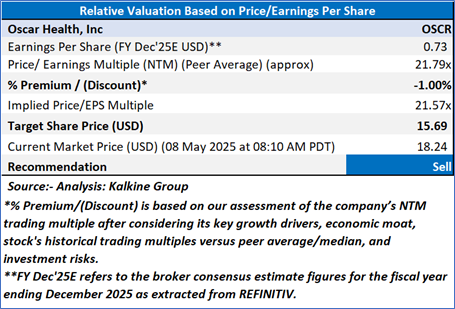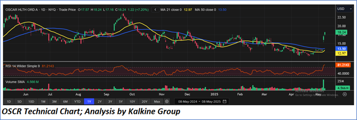 Based on the notional gains, valuation downside and price action stance, a "SELL" recommendation on Oscar Health, Inc (NYSE: OSCR) has been given at the current market price of USD 18.24 as on 08 May 2025 at 08:10 AM PDT.