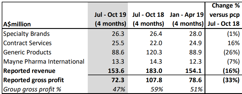 Stable Balance Sheet with Reduction in Net Debt:Mayne Pharma Group Limited (ASX: MYX) is a pharmaceutical company focused on applying its drug delivery expertise to commercialise branded and generic pharmaceuticals. In the recently held Annual General Meeting, the top management of the company addressed its shareholders and stated that group revenue to the end of October stood at $154 million, down by 16% on the prior corresponding period (pcp). Its gross profit of the company went up by 13% on YoY basis to $290 million in FY19 from $256.6 million in FY18. The company has also managed to reduce its net debt by $18.0 million in 2HFY19, resulting in bank leverage ratio of 2x. It can be said that the reduction in the net debt might help the company to focus on strategic growth objectives.