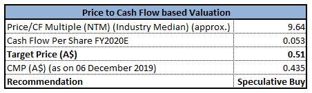 Stock Recommendation: As per ASX, the stock of MYX gave a negative return of 17.14% in the last one month and is currently trading close to its 52-week low of $0.430.In the time span of 5 years from FY15 to FY19, the company witnessed a CAGR of 38.89% in revenue and a CAGR of 40.92% in gross profit. During the year, EBITDA margin of the company stood at 27.9%, higher than the industry median of 24.1%, indicating stable business earnings. Current ratio of the company was 2.23x as compared to the industry median of 1.91x. Thus, considering the current trading levels, business growth in last 5-years, above industry margin and modest outlook, we have valued the company using a relative valuation, i.e., Price/Cash Flow valuation multiple, and arrived at a target price, offering a lower double-digit return (in percentage terms). Hence, we give a “Speculative Buy” rating on the stock at the current market price of $0.435, down by 1.136% on December 06, 2019.