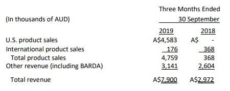 Superior Quarterly Performance: For the quarter ended 30 September 2019, sales of the company went up to $7.9 million from $2.97 million.During the full year FY19, net loss of the company went up by 109% to $35.16 million from $16.51 million in FY18. This resulted in the loss per share for the current year of $2.78 cents as compared to a loss of $1.77 cents per share for the previous period. This was mainly due to the higher operating costs offset by the higher sale of goods during the year. Apparently, it appears that the company has delivered a superior quarterly performance as compared to its annual yearly sales performance. However, quarterly performance is more volatile in nature, and hence, annual performance should form the basis of future performance of the company..png)