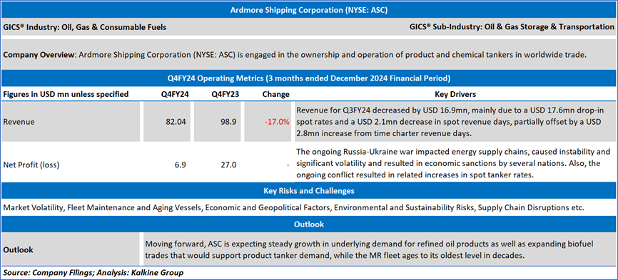 The stock has witnessed a decline of ~48.5 % in the last six months and over the last nine months, it has declined by ~56.9 %. The stock has a 52-week low and 52-week high of USD 23.43 and USD 9.65, respectively and is currently trading below the average of 52-week low and high. ASC was last covered in a report dated ’22 January 2025’.