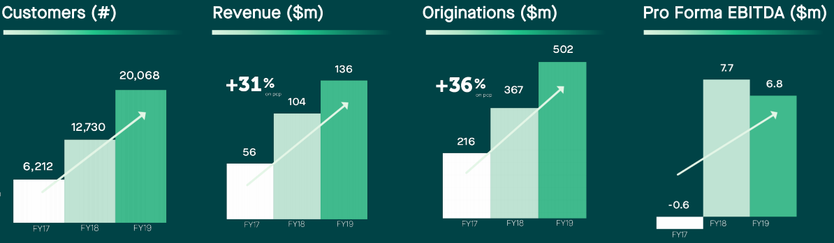 FY19 Highlights: During the year ended 30 June 2019, the company reported revenue amounting to $136 million, representing an increase of 31% on prior corresponding period revenue of $104 million.The company originated loans amounting to $501.7 million in FY19, up 36.6% on pcp. EBITDA for the period came in at $6.8 million, down 12% on the prior corresponding period. In FY19, the company reported a y-o-y increase of 5% in average volume, depicting an improvement in volume per customer. Loans were also simplified with simple annual interest rates ranging from 9.9% - 26.5%, attracting a broader range of customer profiles. The company also launched a mobile app for Business Loan and Line of Credit to enhance customer experience. At the end of the year, the company had 20,068 customers using its platform, up from 12,730 customers in FY18. Two-year customer CAGR for the period covering FY17 – FY19 stands at 80%.