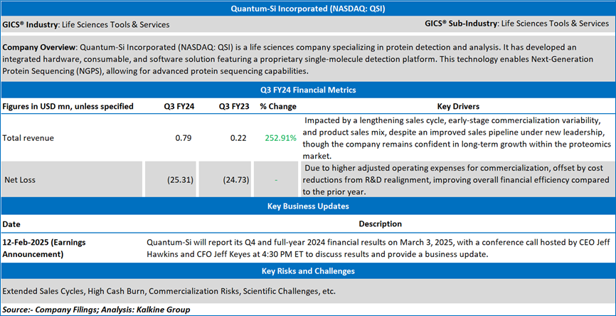 Quantum-Si Incorporated (NASDAQ: QSI) is a life sciences company specializing in protein detection and analysis. It has developed an integrated hardware, consumable, and software solution featuring a proprietary single-molecule detection platform. This technology enables Next-Generation Protein Sequencing (NGPS), allowing for advanced protein sequencing capabilities. This Report covers the Key Financial Metrics, Risks, and Technical Analysis along with the Valuation, Target Price, and Recommendation on the stock.