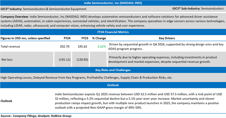 indie Semiconductor, Inc (NASDAQ: INDI) develops automotive semiconductors and software solutions for advanced driver assistance systems (ADAS), automation, in-cabin experiences, connected vehicles, and electrification. The company specializes in edge sensors across various technologies, including LiDAR, radar, ultrasound, and computer vision, enhancing vehicle safety and user experience.