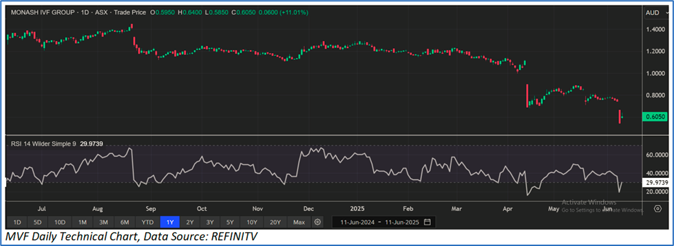 The stock has witnessed a correction of ~28.40% in the last month, and over the last six months, it has declined by ~50.61%. The stock has a 52-week low and 52-week high of AUD 0.537 and AUD 1.450, respectively, and is currently trading close to the 52-week low level. The stock closed at AUD 0.605, up 11.01%, as on 11 June 2025.