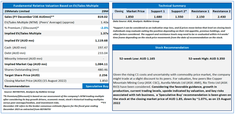 Section 2.0: 29Metals Limited (‘Speculative Buy’ at AUD 1.85 closing price per share as on 15 August 2022)