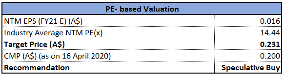 Stock Recommendation: As per ASX, the stock of CAJ is inclined close to its 52-week low level of $0.155, proffering a decent opportunity for accumulation. During 1H20, EBITDA margin of the company was 22%, higher than the industry median of 10.8%, indicating higher profitability. Capitol Health is well placed to navigate the impact of covid-19 pandemic and has implemented a range of operational measures to manage through this difficult period. Considering the trading levels, improvement in margins and positive outlook, we have valued the stock using Price to Earnings based illustrative relative valuation method and have arrived at a target upside of lower double-digit (in percentage terms). Hence, we recommend a ‘Speculative Buy’ rating on the stock at the current market price of $0.200, up by 2.564% on 16 April 2020, owing to its recent update regarding placement to institutional investors.
