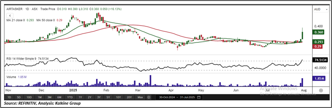 Overview: Airtasker Limited (ASX: ART) is an Australia-based company that operates a technology-driven online marketplace connecting individuals and businesses seeking services with those offering them. The platform enables users to outsource a wide range of local tasks, from household chores to professional services. ART has been a part of the 'Momentum Model Portfolio' since July 01, 2025. Therefore, an 'Exit' stance from the Momentum Model Portfolio is recommended on the stock at the current market price of AUD 0.360 as on July 31, 2025, at 1:06 PM AEST.