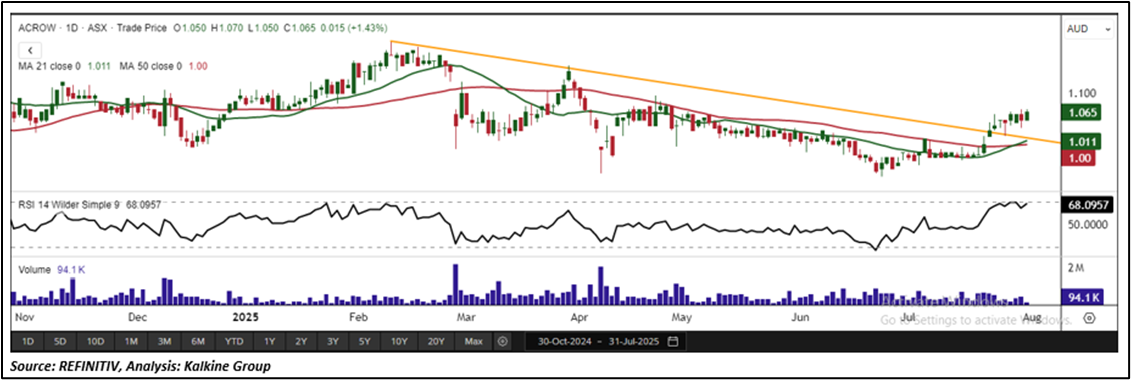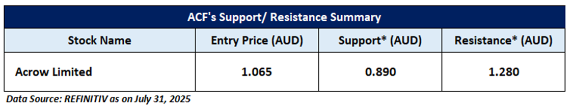 ACF is recommended as a new entry in the 'Momentum Model Portfolio' as on July 31, 2025. Considering the technical analysis, support and resistance levels, an 'Entry' is recommended in the 'Momentum Model Portfolio' at the current market price of AUD 1.065 as on July 31, 2025, at 1:06 PM AEST.