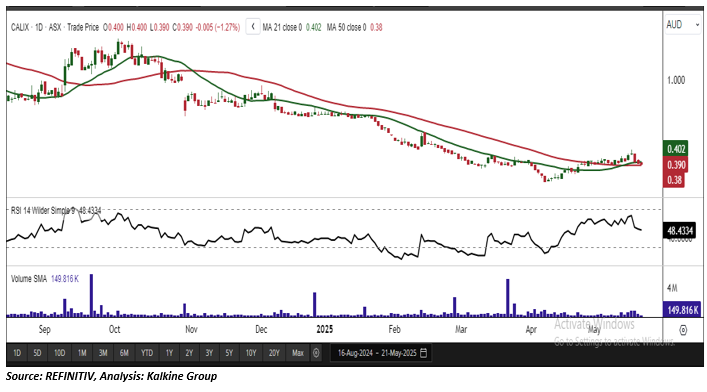 Overview: Calix Limited (ASX: CXL) is an Australian environmental technology company headquartered in Pymble, New South Wales. Established in 2005 and publicly listed on the Australian Securities Exchange in 2018, Calix focuses on developing and commercializing technologies aimed at addressing global challenges in industrial decarbonization and sustainability. CXL has been a part of the 'Momentum Model Portfolio' since May 16, 2025. Therefore, an 'Exit' stance from the Momentum Model Portfolio is recommended on the stock at the current market price of AUD 0.390 as on May 21, 2025, at 2.20 PM AEST.