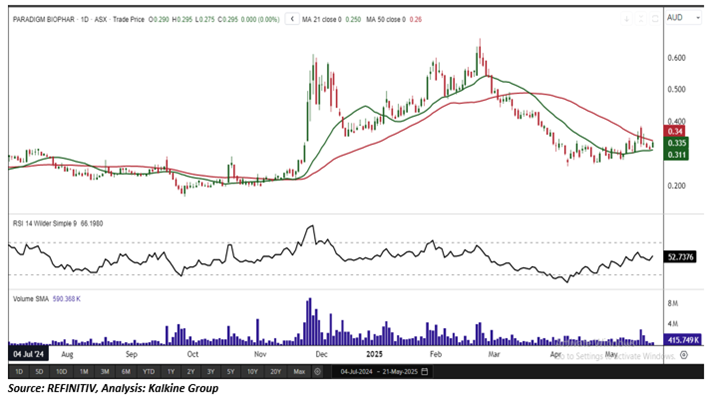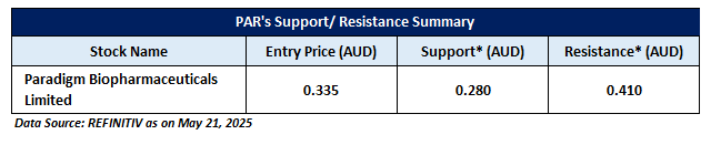 PAR is recommended as a new entry in the 'Momentum Model Portfolio' as on May 21, 2025. Considering the technical analysis, support and resistance levels, an 'Entry' is recommended in the 'Momentum Model Portfolio' at the current market price of AUD 0.335 as on May 21, 2025, at 2.20 PM AEST.