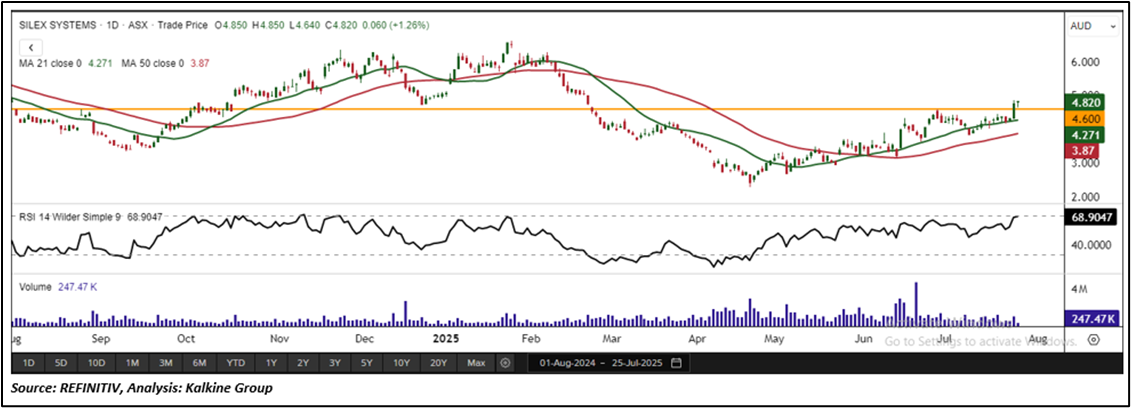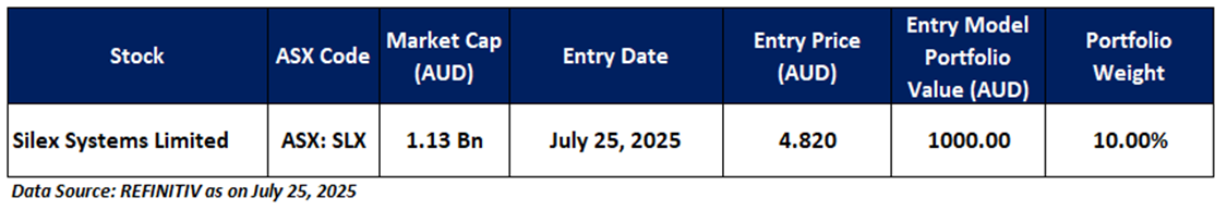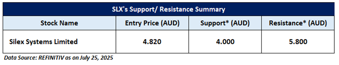 SLX is recommended as a new entry in the 'Momentum Model Portfolio' as on July 25, 2025. Considering the technical analysis, support and resistance levels, an 'Entry' is recommended in the 'Momentum Model Portfolio' at the current market price of AUD 4.82 as on July 25, 2025, at 13:28 PM AEST.