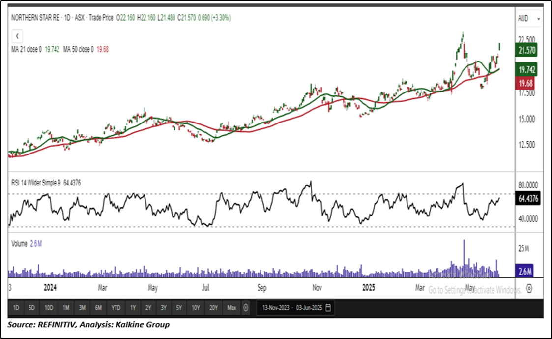 Overview: Northern Star Resources Limited (ASX: NST) is a leading Australian gold producer with a diversified portfolio of high-quality mining operations across Western Australia and Alaska. Established in 2003 and headquartered in Perth, the company has grown into a global-scale miner, focusing on the exploration, development, and processing of gold deposits. NST has been a part of the 'Momentum Model Portfolio' since May 06, 2025. Therefore, an 'Exit' stance from the Momentum Model Portfolio is recommended on the stock at the current market price of AUD 21.57 as on June 03, 2025, at 12:20 PM AEST.