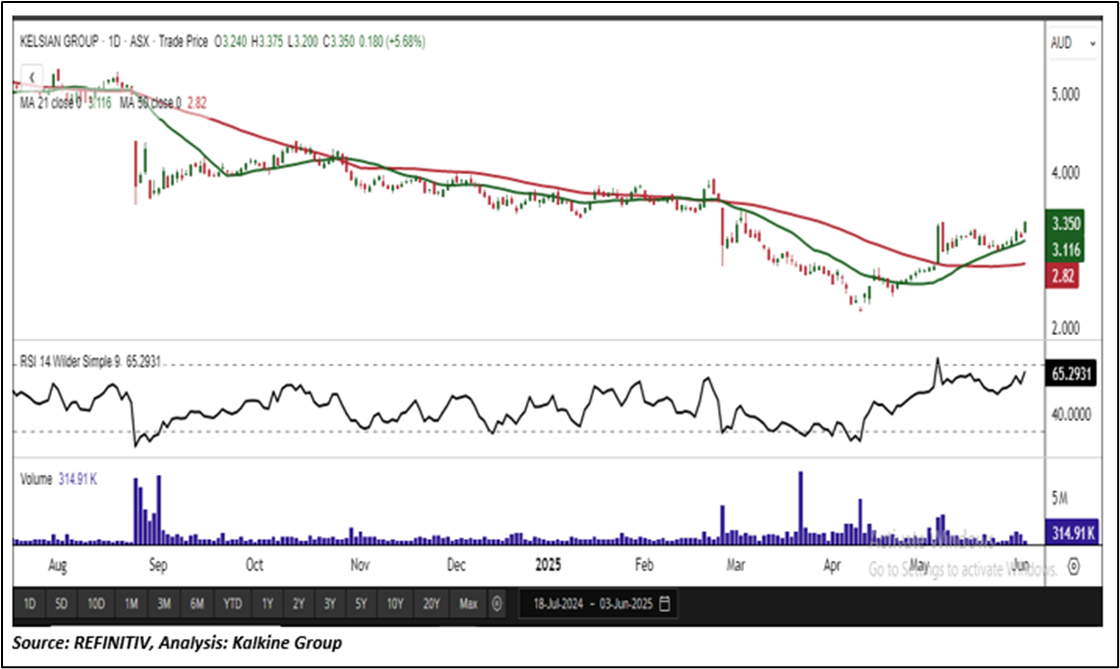 KLS is recommended as a new entry in the 'Momentum Model Portfolio' as on June 03, 2025. Considering the technical analysis, support and resistance levels, an 'Entry' is recommended in the 'Momentum Model Portfolio' at the current market price of AUD 3.350 as on June 03, 2025, at 12:20 PM AEST.