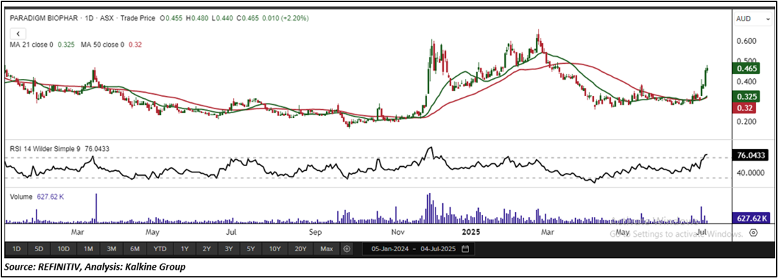 Overview: Paradigm Biopharmaceuticals Limited (ASX: PAR) is a biopharmaceutical company incorporated and domiciled in Australia. The company is engaged in repurposing the drug pentosan polysulfate sodium (PPS) to treat arthralgia driven by injury, inflammation, aging, degenerative disease, infection, or genetics. PAR has been a part of the 'Momentum Model Portfolio' since July 01, 2025. Therefore, an 'Exit' stance from the Momentum Model Portfolio is recommended on the stock at the current market price of AUD 0.465 as on July 04, 2025, at 12:27 PM AEST.
