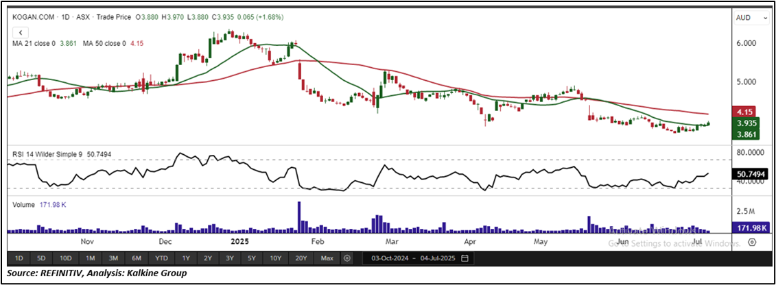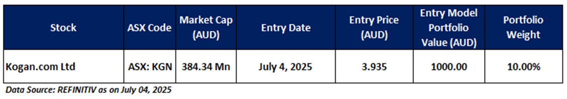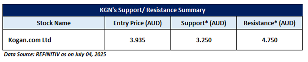 KGN is recommended as a new entry in the 'Momentum Model Portfolio' as on July 04, 2025. Considering the technical analysis, support and resistance levels, an 'Entry' is recommended in the 'Momentum Model Portfolio' at the current market price of AUD 3.935 as on July 04, 2025, at 12:27 PM AEST.