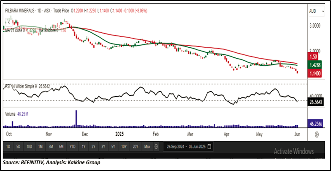 Overview: Pilbara Minerals Limited (ASX: PLS) is an Australian lithium mining company headquartered in West Perth, Western Australia. Established in 2005, the company focuses on the exploration, development, and operation of lithium and other mineral resources. PLS has been a part of the 'Momentum Model Portfolio' since April 30, 2025. Therefore, an 'Exit' stance from the Momentum Model Portfolio is recommended on the stock at the closing price of AUD 1.14 as on June 02, 2025.