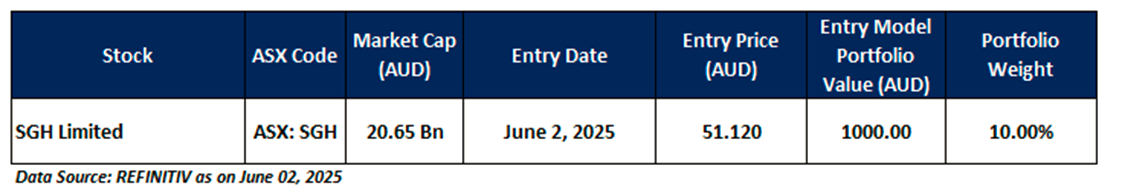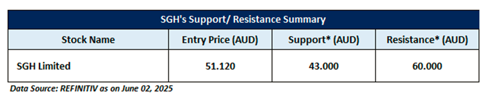 SGH is recommended as a new entry in the 'Momentum Model Portfolio' as on June 02, 2025. Considering the technical analysis, support and resistance levels, an 'Entry' is recommended in the 'Momentum Model Portfolio' at the closing price of AUD 51.12 as on June 02, 2025.