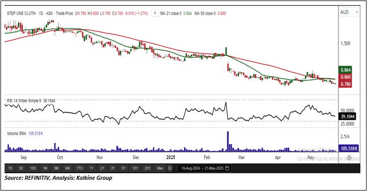 Overview: Step One Clothing Limited (ASX:STP) is an online direct-to-consumer brand specialising in sustainably sourced and ethically manufactured innerwear. The company offers a wide range of high-quality, organically grown, and certified underwear designed to suit various body types. With its innovative designs and customer base, Step One has expanded into a multinational business, operating in Australia, the US, and the UK. STP has been a part of the 'Momentum Model Portfolio' since April 30, 2025. Therefore, an 'Exit' stance from the Momentum Model Portfolio is recommended on the stock at the current market price of AUD 0.780 as on May 21, 2025, at 1:20 PM AEST.