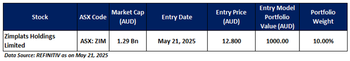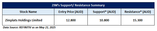 ZIM is recommended as a new entry in the 'Momentum Model Portfolio' as on May 21, 2025. Considering the technical analysis, support and resistance levels, an 'Entry' is recommended in the 'Momentum Model Portfolio' at the current market price of AUD 12.80 as on May 21, 2025, at 1:20 PM AEST.