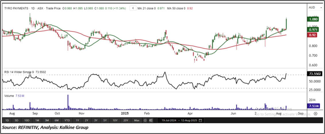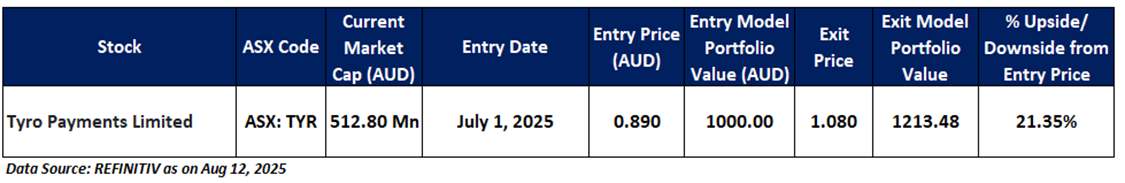 Overview: Tyro Payments Limited (ASX: TYR) is an Australia-based technology-driven company, involved in providing payment solutions and business banking products to Australian businesses. TYR has been a part of the 'Momentum Model Portfolio' since July 01, 2025. Therefore, an 'Exit' stance from the Momentum Model Portfolio is recommended on the stock at the current market price of AUD 1.08 as on August 12, 2025, at 2:41 PM AEST.