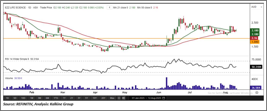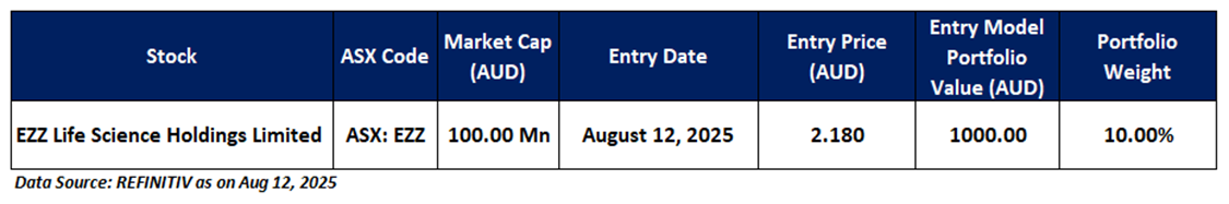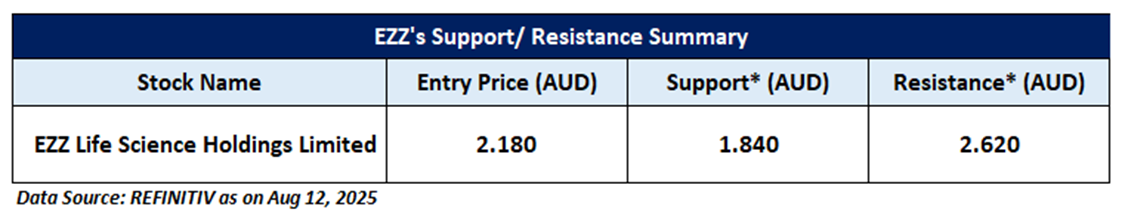 EZZ is recommended as a new entry in the 'Momentum Model Portfolio' as on August 12, 2025. Considering the technical analysis, support and resistance levels, an 'Entry' is recommended in the 'Momentum Model Portfolio' at the current market price of AUD 2.180 as on August 12, 2025, at 2:41 PM AEST.