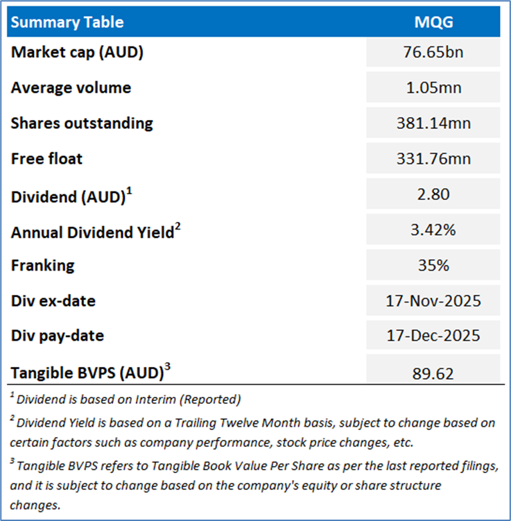 Company Overview: Macquarie Group Limited (ASX: MQG) is an Australia-based global financial services company. The Company specializes in asset management, retail and business banking, wealth management, leasing and asset financing, market access, commodity trading, renewables development, specialist advice, access to capital and principal investment. Kalkine’s Daily Report covers the Key Financial Metrics, Risks, Outlook, and Technical Analysis along with the Valuation, Target Price, and Recommendation on the stock.