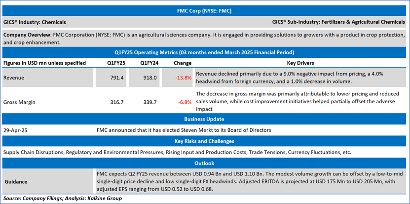 The stock has witnessed a decline of ~37.7% in the last six months and over the last nine months, it has declined by ~38.3%. The stock has a 52-week low and 52-week high of USD 32.83 and USD 68.72, respectively and is currently trading below the average of 52-week low and high. FMC was last covered in a report dated ‘27 March 2025’.