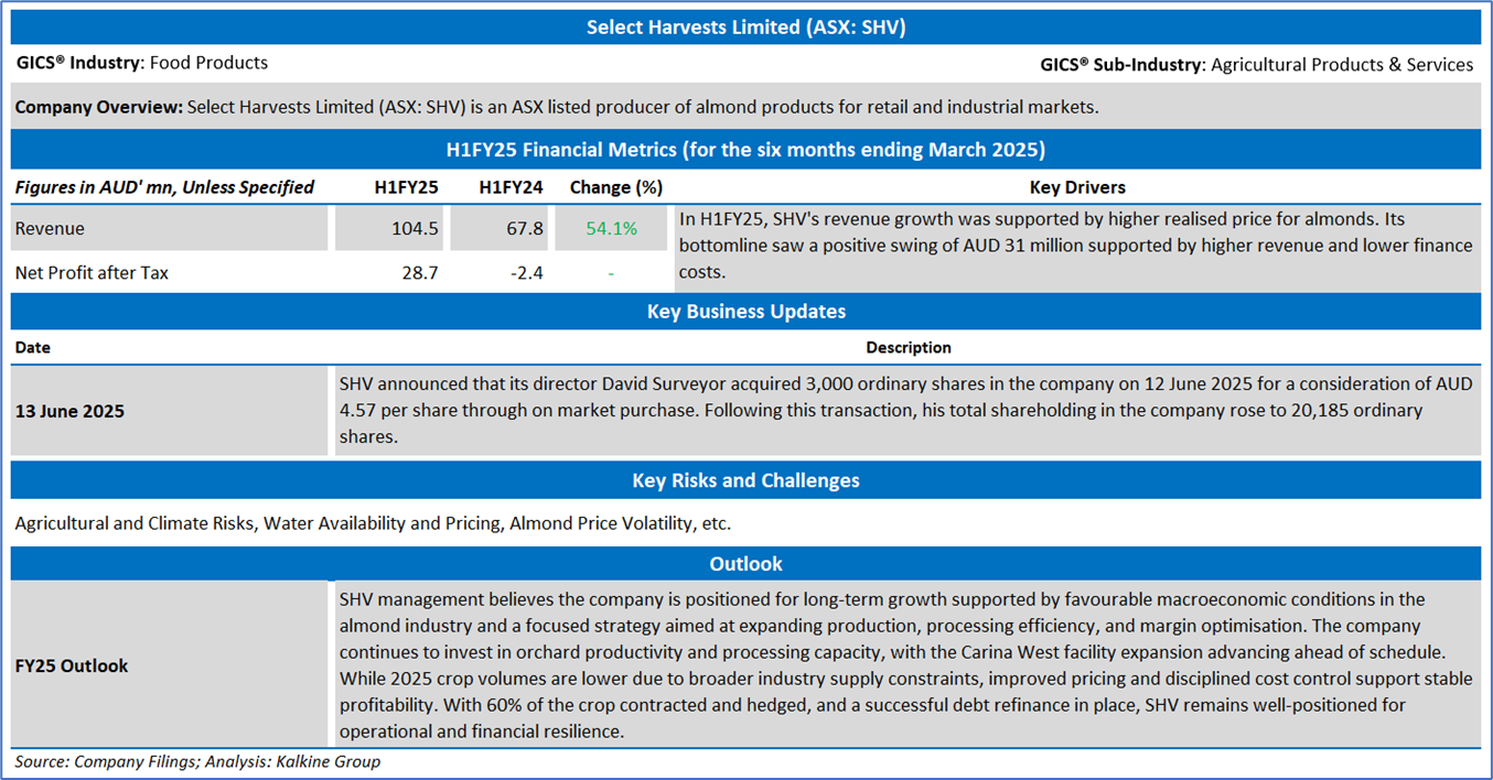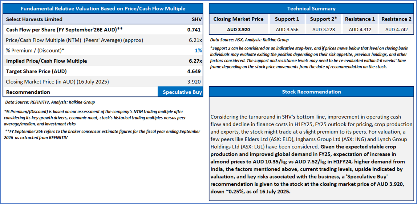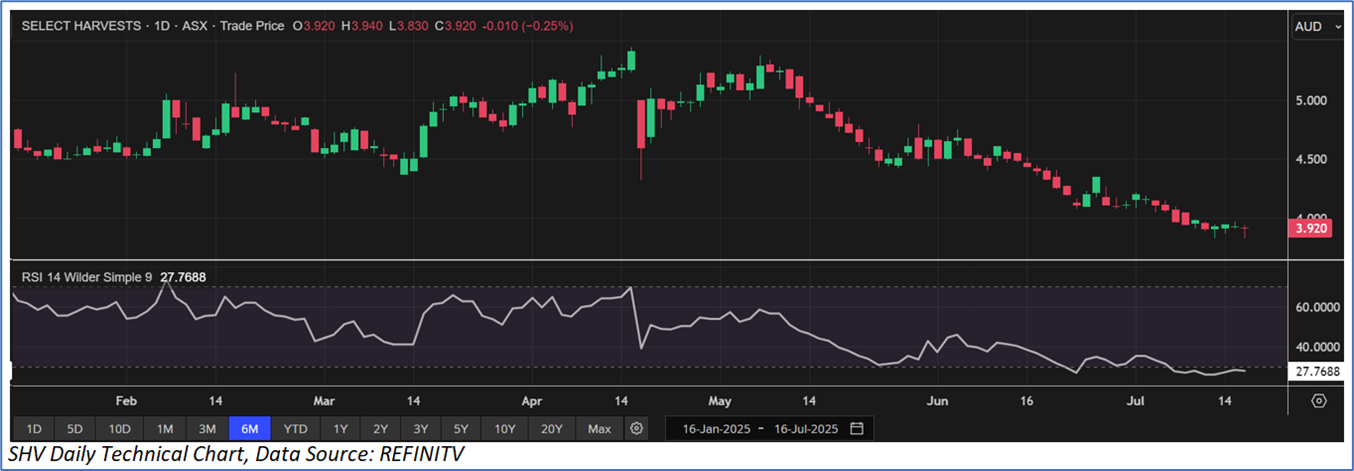 Section 2.0: Select Harvests Limited (ASX: SHV) (‘Speculative Buy’ at AUD 3.920, Closing Market Price as on 16 July 2025)