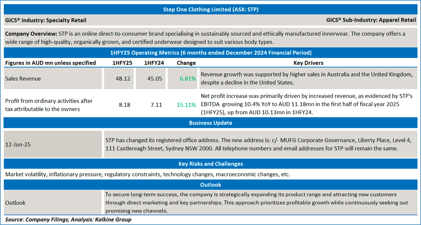 Company Overview: Step One Clothing Limited (ASX:STP) is an online direct-to-consumer brand specialising in sustainably sourced and ethically manufactured innerwear. The company offers a wide range of high-quality, organically grown, and certified underwear designed to suit various body types. With its innovative designs and customer base, Step One has expanded into a multinational business, operating in Australia, the US, and the UK. Kalkine’s Daily Report covers the Key Financial Metrics, Risks, Outlook, and Technical Analysis along with the Valuation, Target Price, and Recommendation on the stock.