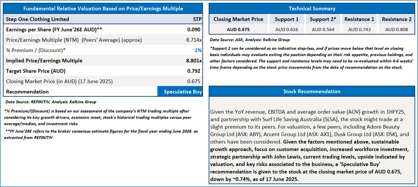 Section 2.0: Step One Clothing Limited (‘Speculative Buy’ at AUD 0.675, closing market price per share as on 17 June 2025)