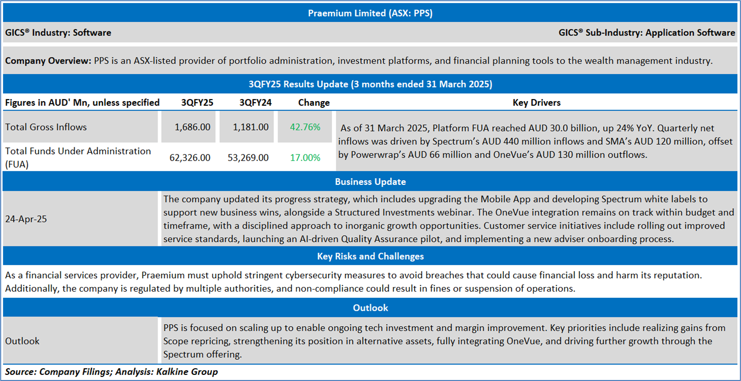 Company Overview: Praemium Limited (ASX: PPS) is an ASX-listed provider of portfolio administration, investment platforms and financial planning tools to the wealth management industry. Kalkine’s Daily Report covers the Key Financial Metrics, Risks, Outlook, and Technical Analysis along with the Valuation, Target Price, and Recommendation on the stock.