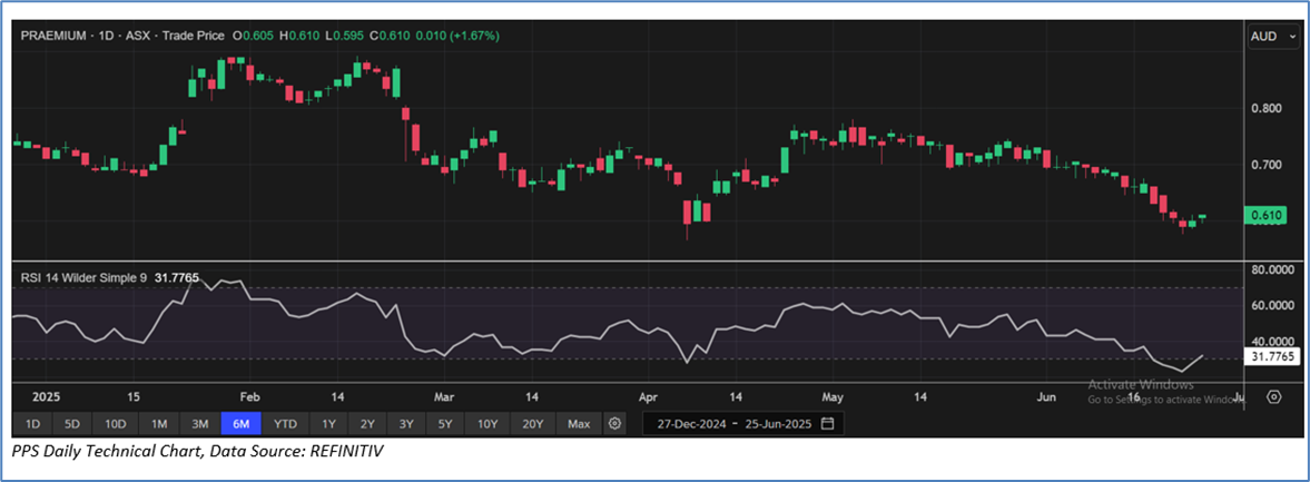 The stock has witnessed a dip of ~18.37% in the last one month, and over the past three months, it has decreased by ~16.08%. The stock has a 52-week low and 52-week high of AUD 0.415 and AUD 0.893, respectively, and is currently trading below the 52-week high-low average. PPS was last covered in a report dated ’30 May 2025’.