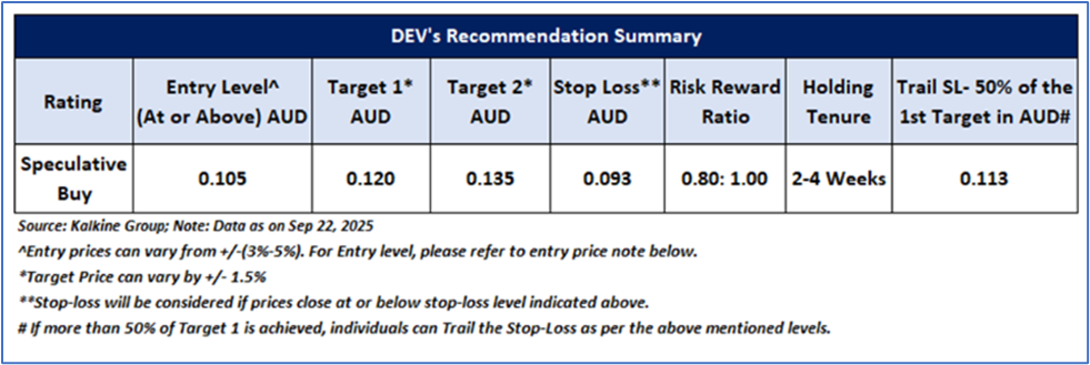 As per the previous recommendation on DEV on 22 September 2025, a ‘Speculative Buy’ rating was given on the stock at AUD 0.105, and noted below are the details of support and resistance provided in the previous report:
