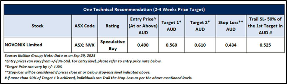 As per the previous recommendation on NVX on 29 September 2025, a ‘Speculative Buy’ rating was given on the stock at AUD 0.490, and noted below are the details of support and resistance provided in the previous report: