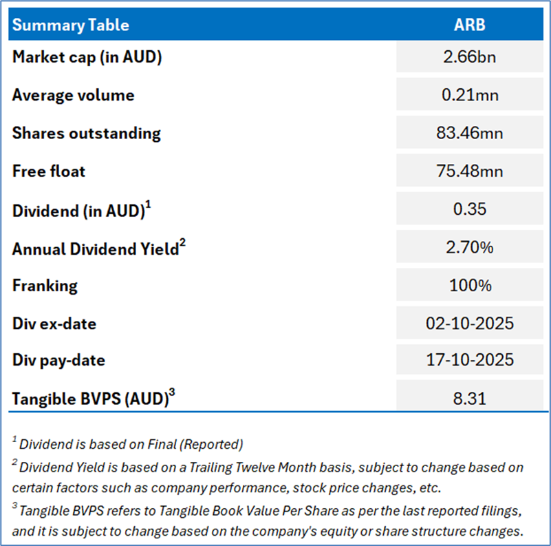 Company Overview: ARB Corporation Limited (ASX: ARB) is an Australia-based company, which designs, manufactures, distributes and sells motor vehicle accessories and light metal engineering works. Its product range includes a host of different accessories, from vehicle specific applications to a range of accessories, which are suitable for vehicles. Kalkine’s Daily Report covers the Key Financial Metrics, Risks, Outlook, and Technical Analysis along with the Valuation, Target Price, and Recommendation on the stock.