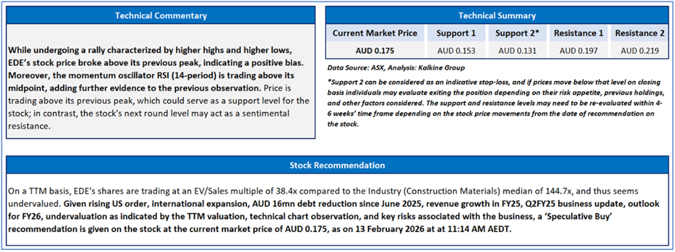 As per the previous recommendation on EDE on 13 February 2026, a ‘Speculative Buy’ rating was given on the stock at AUD 0.175, and noted below are the details of support and resistance provided in the previous report: