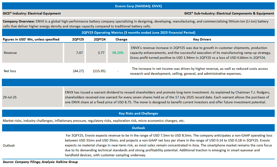 Company Overview: Enovix Corporation (NASDAQ: ENVX) is a global high-performance battery company specializing in designing, developing, manufacturing, and commercializing lithium-ion (Li-ion) battery cells that deliver higher energy density and storage capacity compared to traditional battery cells. Kalkine’s Daily Report covers the Key Financial Metrics, Risks, Outlook, and Technical Analysis along with the Valuation, Target Price, and Recommendation on the stock.