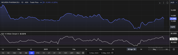Stock might trade at some premium to its peers, considering the progress in its drug development pipeline, positive results for NNZ-2591 in clinical trials focused on neurodevelopmental conditions, comprehensive income growth in FY24, and other factors. Peers include Cochlear Ltd (ASX: COH), Nanosonics Ltd (ASX: NAN), CSL Ltd (ASX: CSL), and others. Considering that the stock has surpassed its R2 level, macroeconomic uncertainty, current trading level, and risks associated, the share price can face consolidation at the current levels. Hence, a ‘Sell’ recommendation is given on the stock at the current market price of AUD 12.89, at 10:15 AM, AEST, as of 12 May 2025.