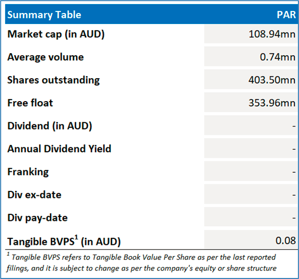 The stock went down by ~12.1% in the last one week, and over the last six months, the stock went down by ~44.5%. The stock has a 52-week low and 52-week high of AUD 0.165 and AUD 0.660, respectively, and is currently trading below the 52-week high-low average. PAR was last covered in a report dated '13 August 2025'.