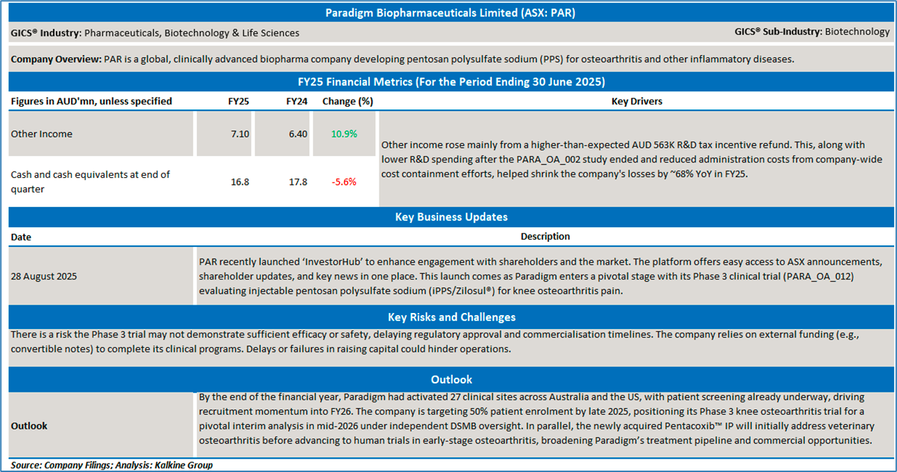 Company Overview: Paradigm Biopharmaceuticals Limited (ASX: PAR) is a global, clinically advanced biopharma company developing pentosan polysulfate sodium (PPS) for osteoarthritis and other inflammatory diseases. With a Phase 3 lead asset, Zilosul®, the company targets major unmet medical needs globally. Headquartered in Melbourne, PAR operates across the US and the EU. Kalkine’s Daily Report covers the Key Financial Metrics, Risks, Outlook, and Technical Analysis along with the Valuation, Target Price, and Recommendation on the stock.